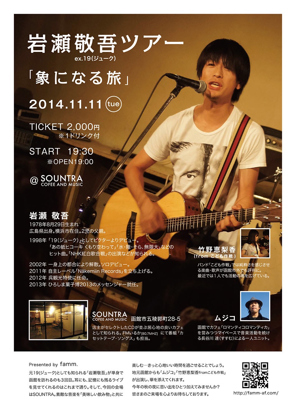 会場:SOUNTRA COFFEE AND MUSIC (函館市五稜郭町28-5) 開場 19:00 開演 19:30 チケット 2,000円(1ドリンク付)